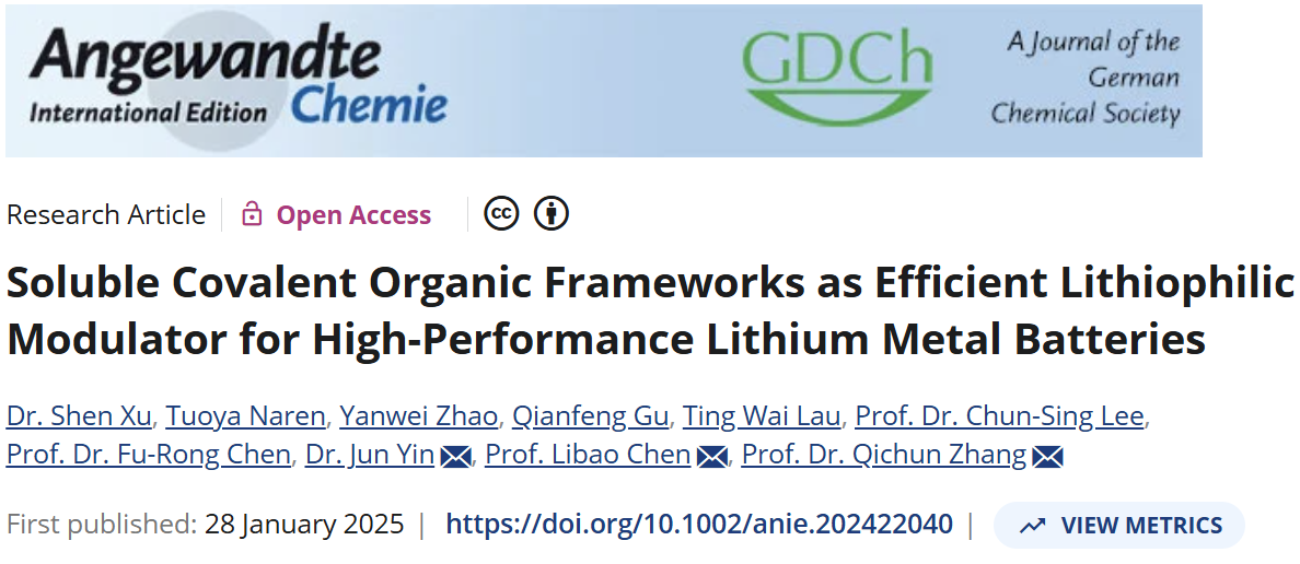 近日,探花porn 材料科学与工程探花porn 、柔性电子全国重点实验室徐申教授团队在可溶多功能共价有机框架领域取得了最新研究进展,相关成果以“Soluble Covalent Organic Frameworks as Efficient Lithiophilic Modulator for High-Performance Lithium Metal Batteries”为题发表在国际学术期刊Angewandte Chemie International Edition(《德国应用化学》)上。重点实验室徐申教授、中南大学博士生娜仁托雅为论文共同第一作者,香港城市大学张其春教授、陈福荣教授、中南大学陈立宝教授、香港理工大学殷俊助理教授为论文共同通讯作者。